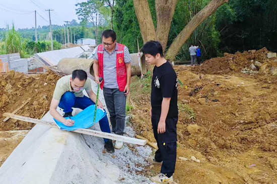 潘荣海带领驻村工作队队员在黎明村的首个村级公园、停车场查看项目进度情况。广旅集团供图