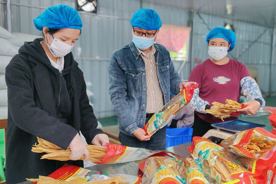 潘荣海(中)在广旅集团援建的村农副产品加工车间与务工群众研究优化农副产品包装流程。广旅集团供图